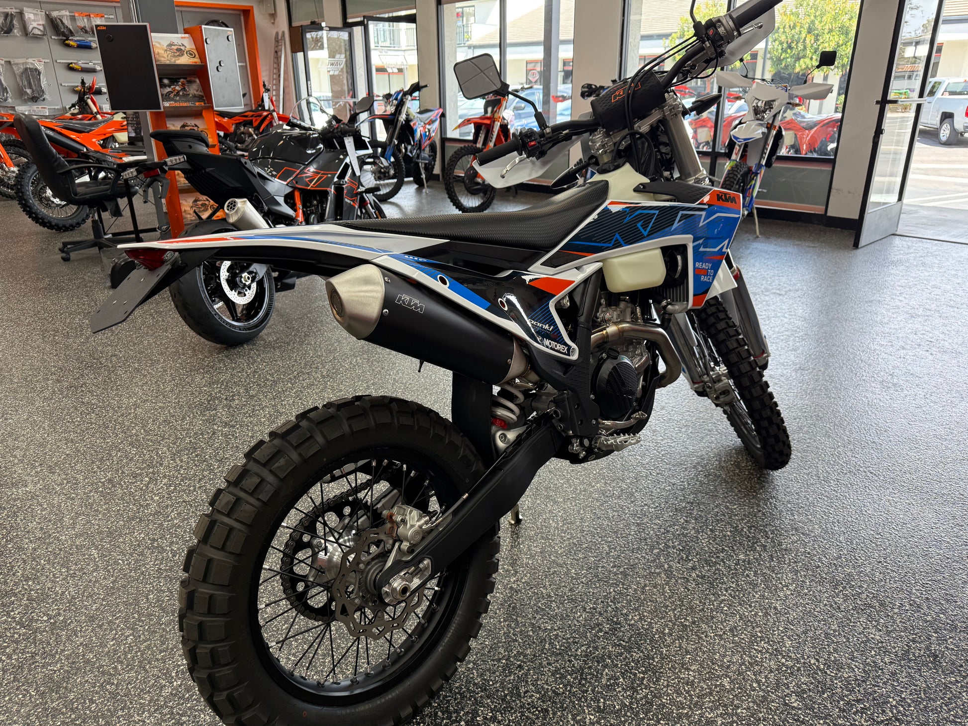 The chassis is purpose-built for extreme off-road performance. A central double-cradle 25CrMo4 steel frame offers exceptional stability while maintaining lightweight agility, giving riders confidence when attacking rocky climbs, deep sand washes, and long desert sections. KTM pairs this frame with WP XACT 48mm front suspension and a WP XPLOR PDS rear shock, delivering outstanding control, adjustability, and bottoming resistance when pushing hard across unpredictable terrain.
